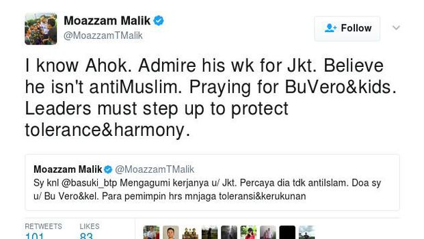 “Saya kenal Ahok. Saya mengagumi kerjanya untuk Jakarta. Percaya bahwa dia bukanlah antiMuslim. Doa saya untuk Ibu Vero dan keluarga. Pemimpin harus menjaga toleransi dan kerukunan,” tulis Moazzam seperti yang dikutip detikcom, Rabu (10/5/2017).